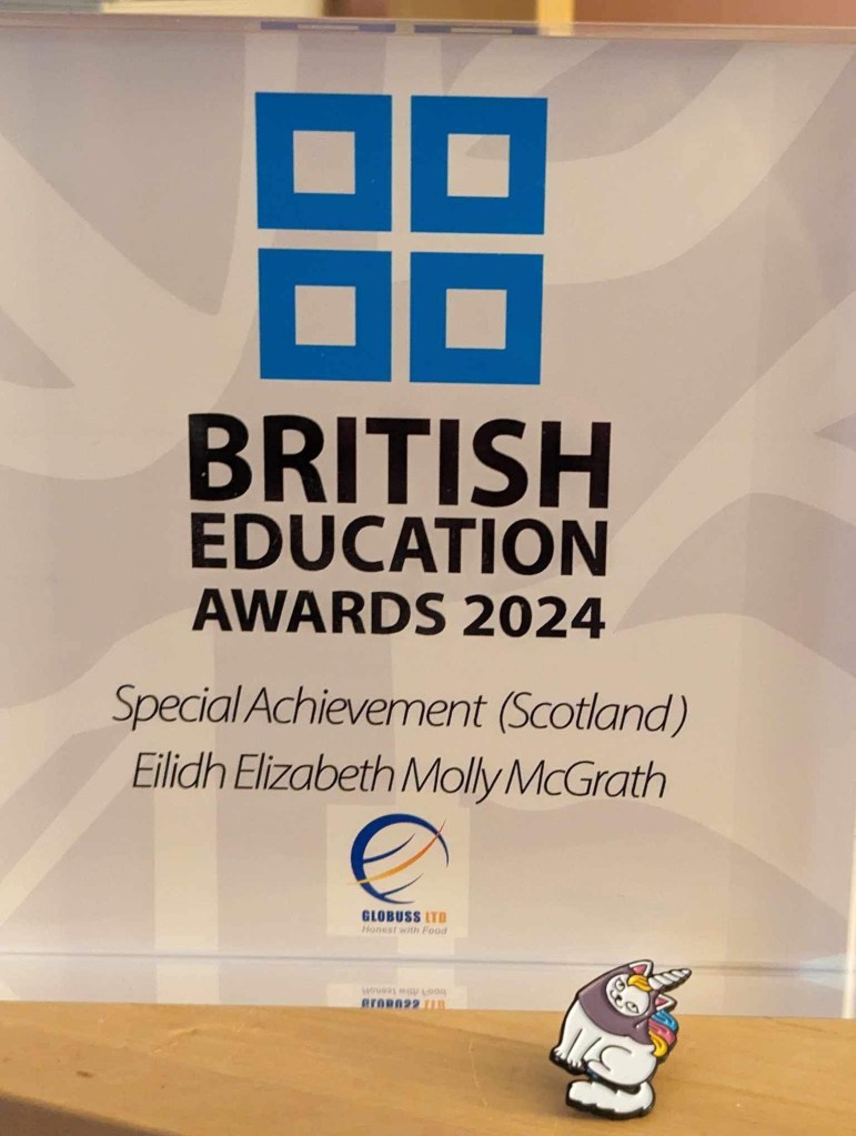 The time for the Special Achievement category came, behind my pin, my heart was racing like one of my dad’s ACDC tracks! Suddenly all 4 finalists were declared winners, I couldn’t believe it! In a minute, two men in suits were lifting me in my wheelchair onto the stage and I was being presented with a framed certificate and a glass trophy!